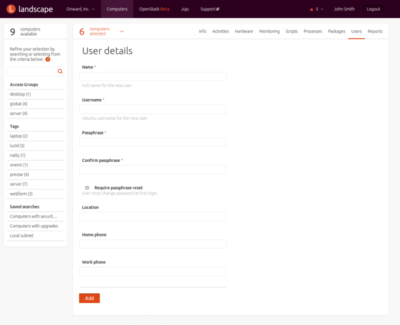 You may also tick a checkbox to delete the user's home folders as well. Press the button at the bottom of the screen to complete the operation.The button displays a User details screen that lets you change details such as the person's name, primary group, passphrase, location, and telephone numbers, and add or remove the user from groups on the selected computers.